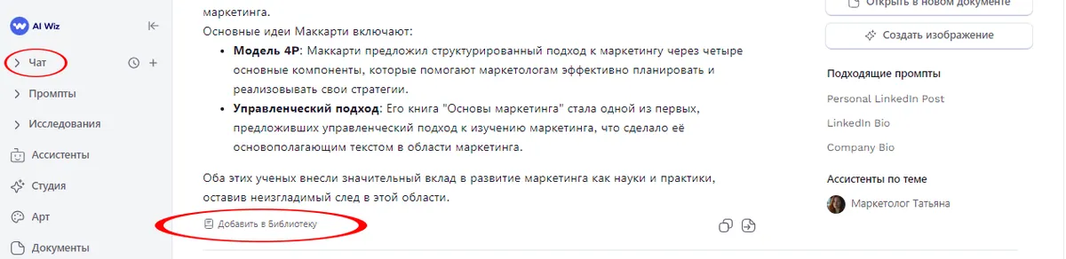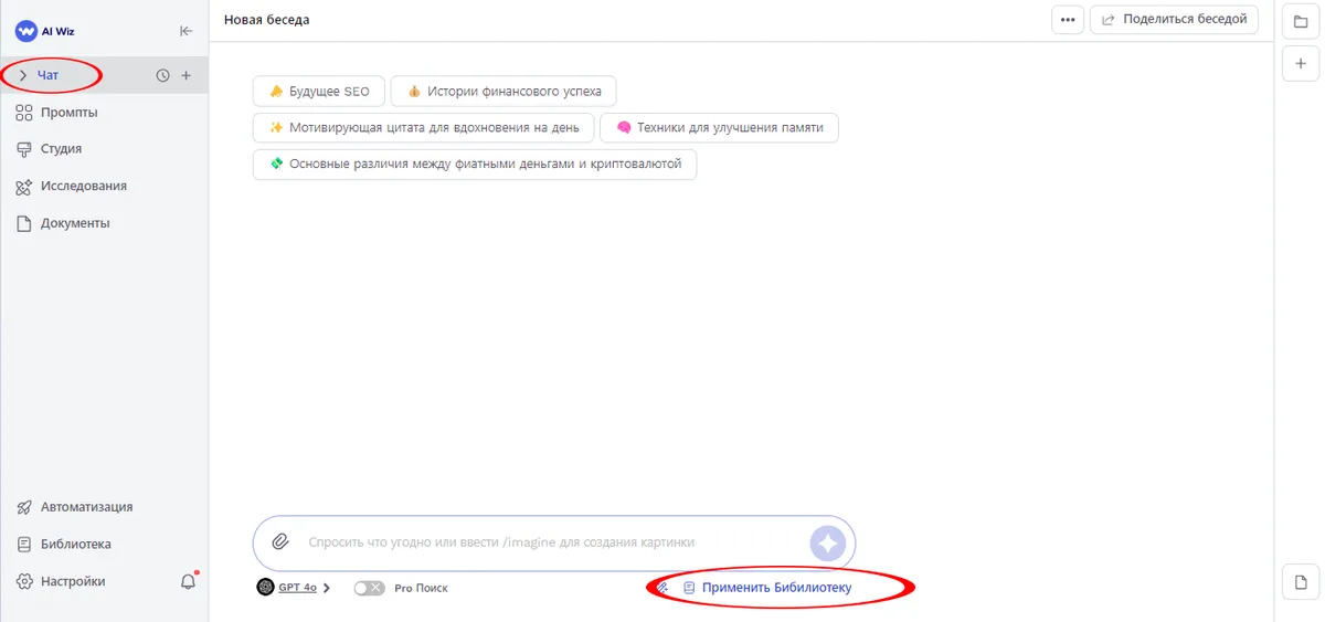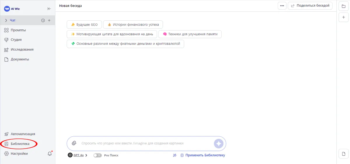 Важное примечание: Функционал инструмента "Библиотека" в AI Wiz не ограничивается только разделом Чат. Вы можете применять вашу персонализированную Библиотеку при работе с готовыми шаблонами-промптами, инструментом "Исследования", а также при взаимодействии с различными ИИ-ассистентами на платформе. Это позволяет обеспечить согласованность и персонализацию во всех аспектах вашей работы с AI Wiz, независимо от конкретного инструмента или задачи.