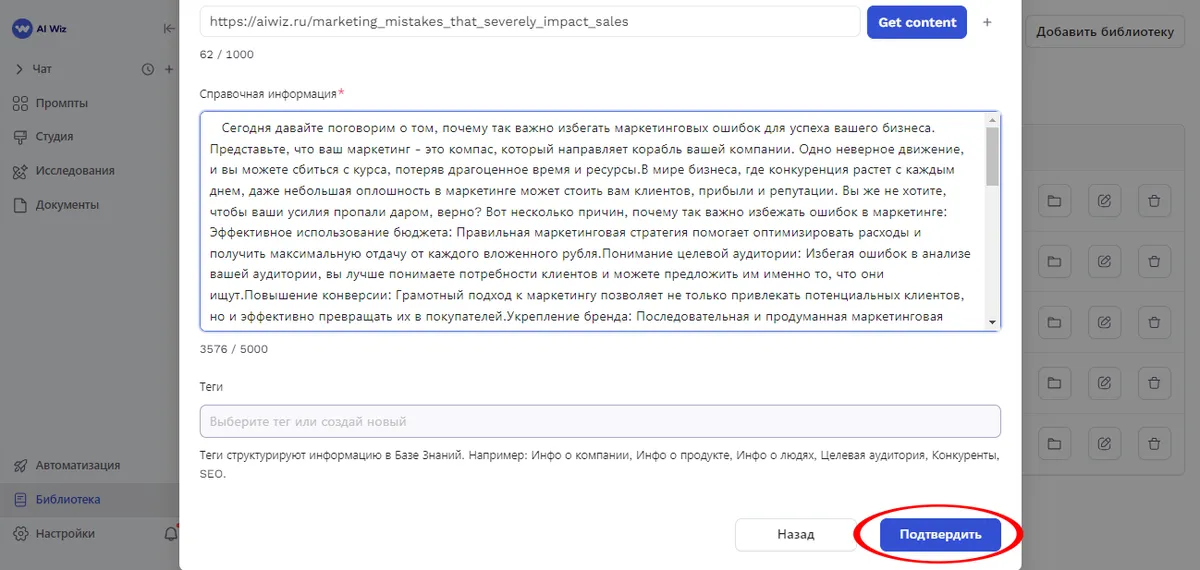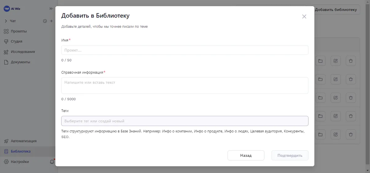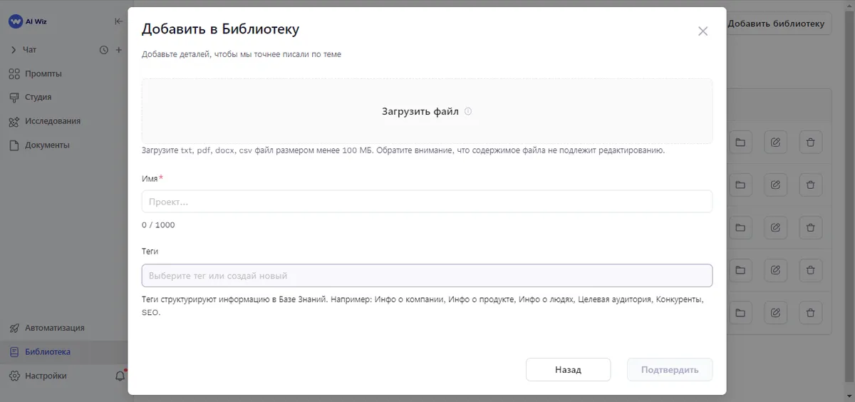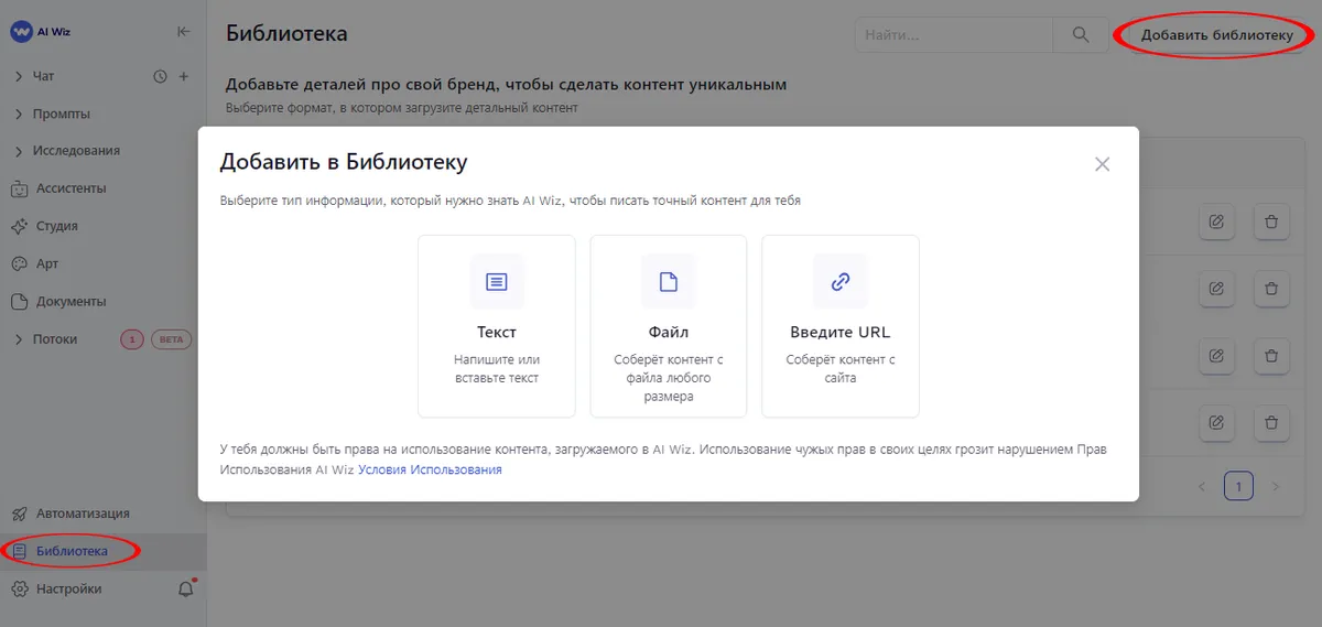 "Библиотека" AI Wiz - это ваше персональное хранилище знаний, загружайте в неё свежие и актуальные данные: информацию о вашей компании, продуктах, последних новостях и других важных данных. Это поможет ИИ создавать контент, который будет наиболее релевантным именно для вас и максимально соответствующим потребностям бизнеса и компании.