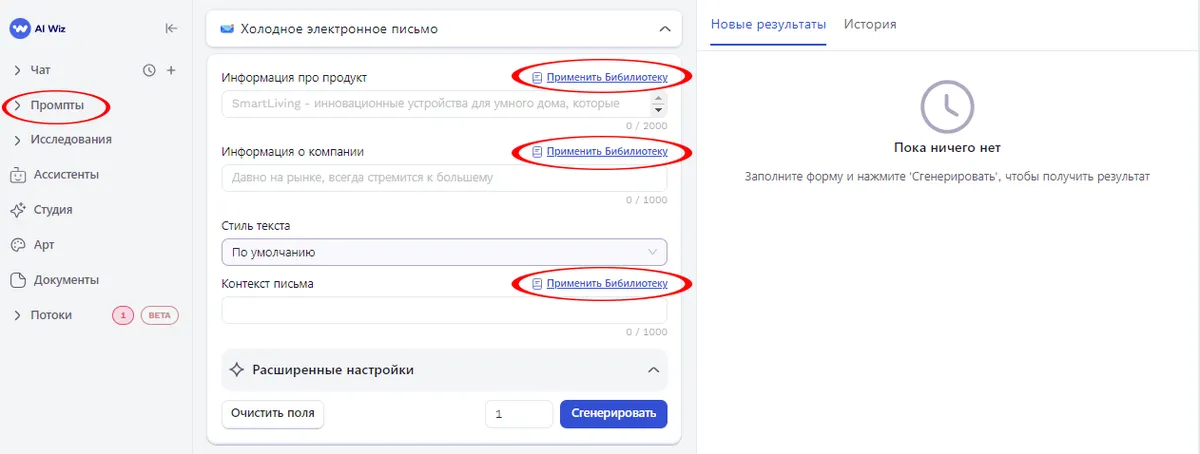 AI Wiz представляет передовой инструмент "Библиотека", разработанный для генерации и модификации текстов с учетом специфики вашего бренда. Этот функционал позволяет сохранить неповторимый стиль и эмоциональную окраску вашей компании, учитывая все ключевые аспекты ее истории и особенности бизнеса.