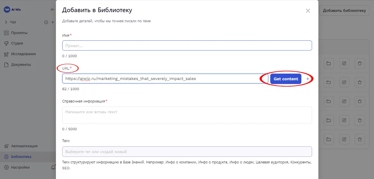 Импорт по URL: Введите ссылку на веб-страницу в поле URL и нажмите кнопку "Get content". Данные из указанной веб-страницы будут загружены в вашу библиотеку. Если извлеченный текст слишком большой, вы можете сохранить его как файл или отредактировать.