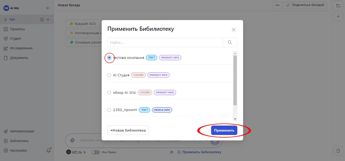 Процесс интеграции прост и интуитивно понятен: достаточно нажать кнопку "Применить Библиотеку" в соответствующем разделе интерфейса. Это позволяет AI Wiz учитывать ваши специфические знания и информацию при генерации ответов, создании контента или анализе данных.
