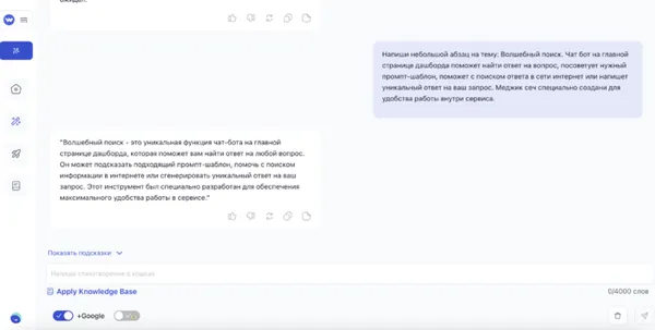 Волшебный поиск - это уникальная функция чат-бота на главной странице дашборда, которая поможет вам найти ответ на любой вопрос. Он может подсказать подходящий промпт-шаблон, помочь с поиском информации в интернете или сгенерировать уникальный ответ на ваш запрос. Этот инструмент был специально разработан для обеспечения максимального удобства работы в сервисе