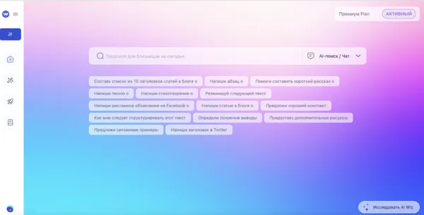 ИИ помощник Wiz Чат - это чат-бот нового поколения, который предлагает пользователям уникальные возможности для общения и поиска информации. Он обладает всеми преимуществами искусственного интеллекта и нейросетей и способен обеспечить высококачественное общение на русском языке без использования VPN. Будь то общение по интересующим вас темам, поиск информации или обучение - Wiz Чат станет вашим незаменимым помощником