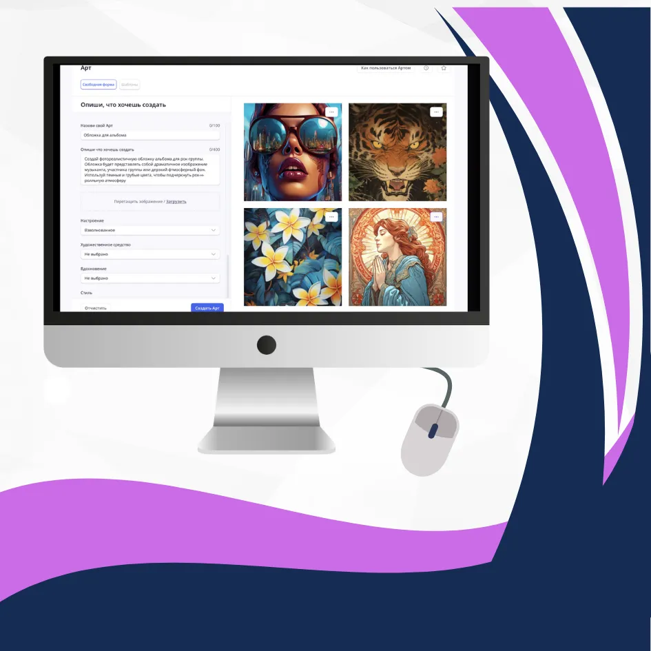 - Уникальность: Каждое изображение, созданное ИИ, является неповторимым произведением.